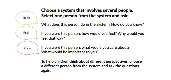 To help children think about different perspectives, choose a different person from the story and ask the questions again. For example the mothers perspective