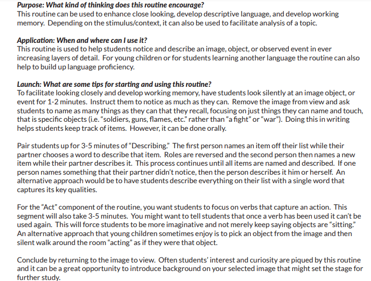 The visual thinking routine we are learning about this week is the Name, Describe, Act. A routine for looking closely, noticing, developing memory & analyzing. Let’s learn about young inventors, innovators, and campaigners.